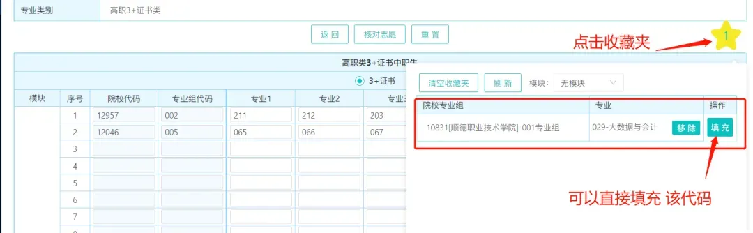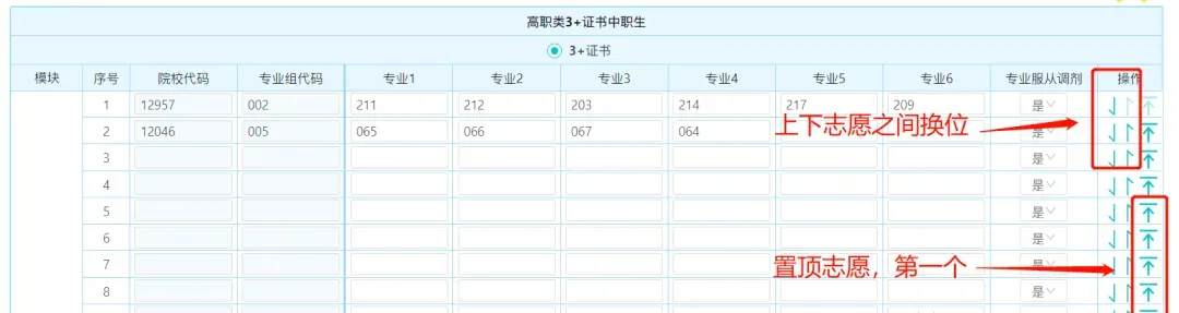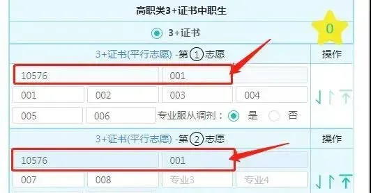 专科组输入院校代码、专业组代码和专业代码填报,一共可以填35个院校专业组,可以不填满。