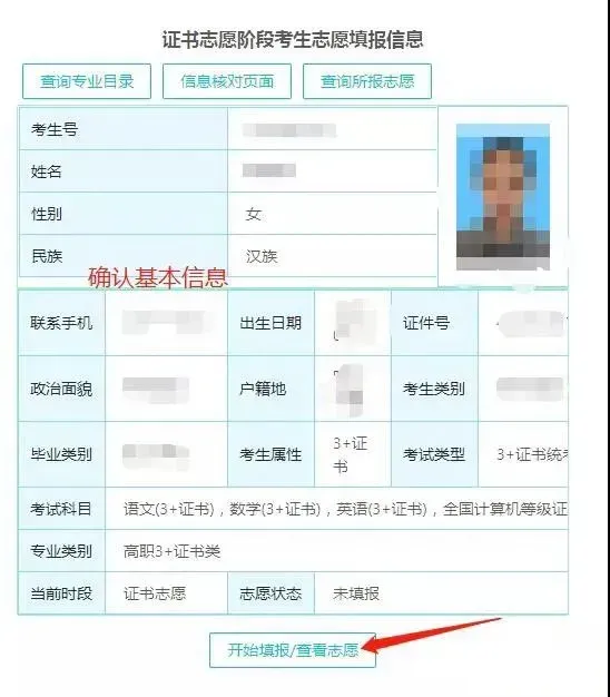 选择【证书志愿填报】,核对相关信息。