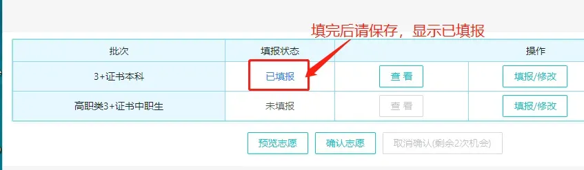点击保存志愿,填报状态从【未填报】中改为【已填报】。