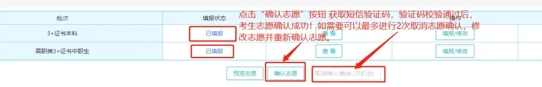 关于志愿修改:在规定时间内,在未进行网上志愿确认前可多次修改所填报的志愿;首次“确认志愿”后,如有需要可最多进行2次取消志愿确认,修改志愿并重新确认志愿的机会。