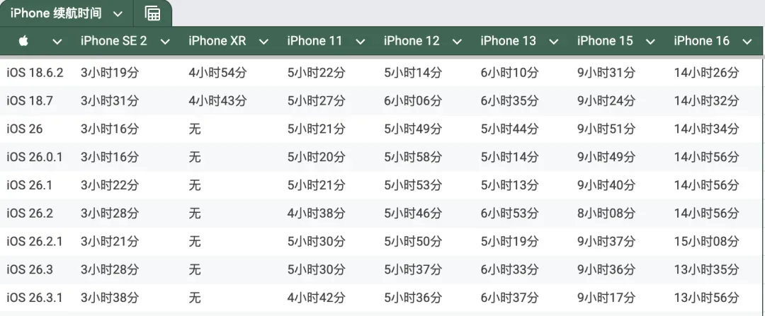 iPhone 16:继上个版本大幅下滑后,26.3.1 终于止跌回升,提升21分钟的续航,建议升级优化体验。