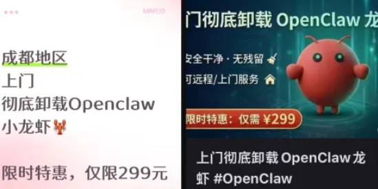 现在,互联网上已经出现了上门卸载“龙虾”(OpenClaw)的服务,报价从29.9到299元不等,普遍低于安装OpenClaw的价格,而且还会写上“专业卸载,安全干净无残留”,“上门卸载解决你的AI焦虑”,“一次上门、彻底卸载,守护最好的人类”,“专治各种AI上瘾症、token耗尽焦虑”等宣传语句。