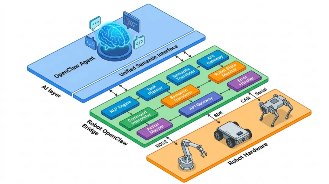 Robot OpenClaw Bridge 的答案是:定义一层与具体机型无关的抽象——上层只面向语义编排工作流,底层再各自适配不同机器人。
