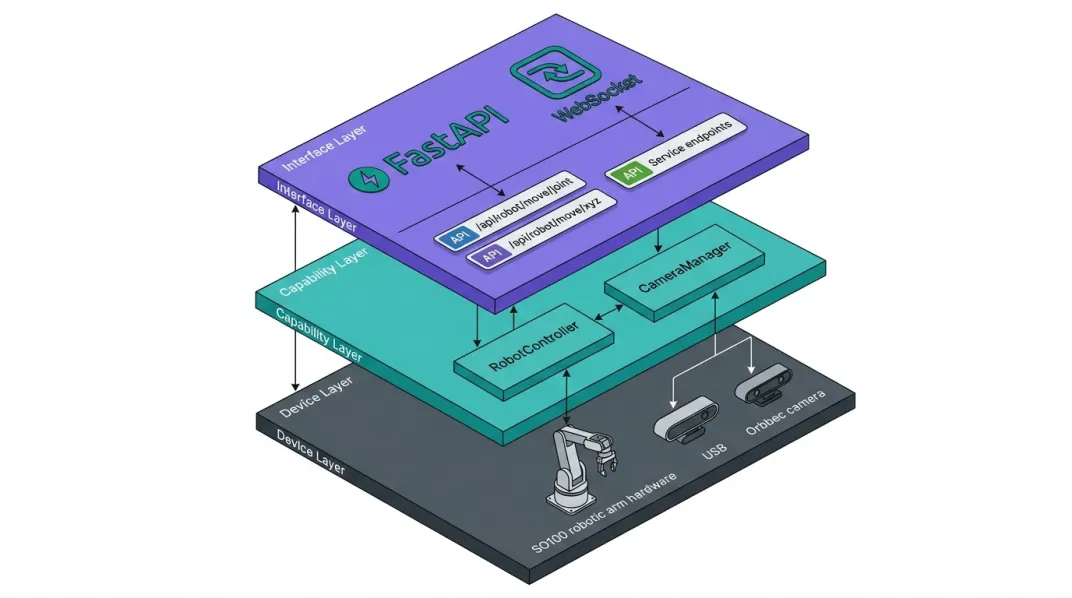 Plain Text┌─────────────────┐ ┌─────────────────┐ ┌─────────────────┐│ 接口层 │ │ 能力层 │ │ 设备层 ││ FastAPI + WS │ ───→ │ RobotController │ ───→ │ SO100 机械臂 ││ │ │ CameraManager │ ───→ │ USB/Orbbec 相机 │└─────────────────┘ └─────────────────┘ └─────────────────┘ |