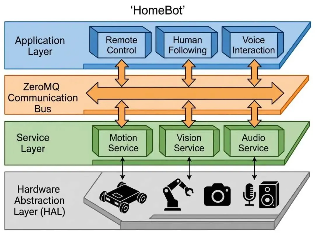 Plain TextApplication Layer 应用层:遥控 / 人跟随 / 语音 / 模仿学习↓ZeroMQ Bus 通信总线↓Service Layer 服务层:运动服务 / 视觉服务 / 语音服务↓HAL Layer 硬件抽象层:底盘 / 机械臂 / 摄像头 / 音频 |