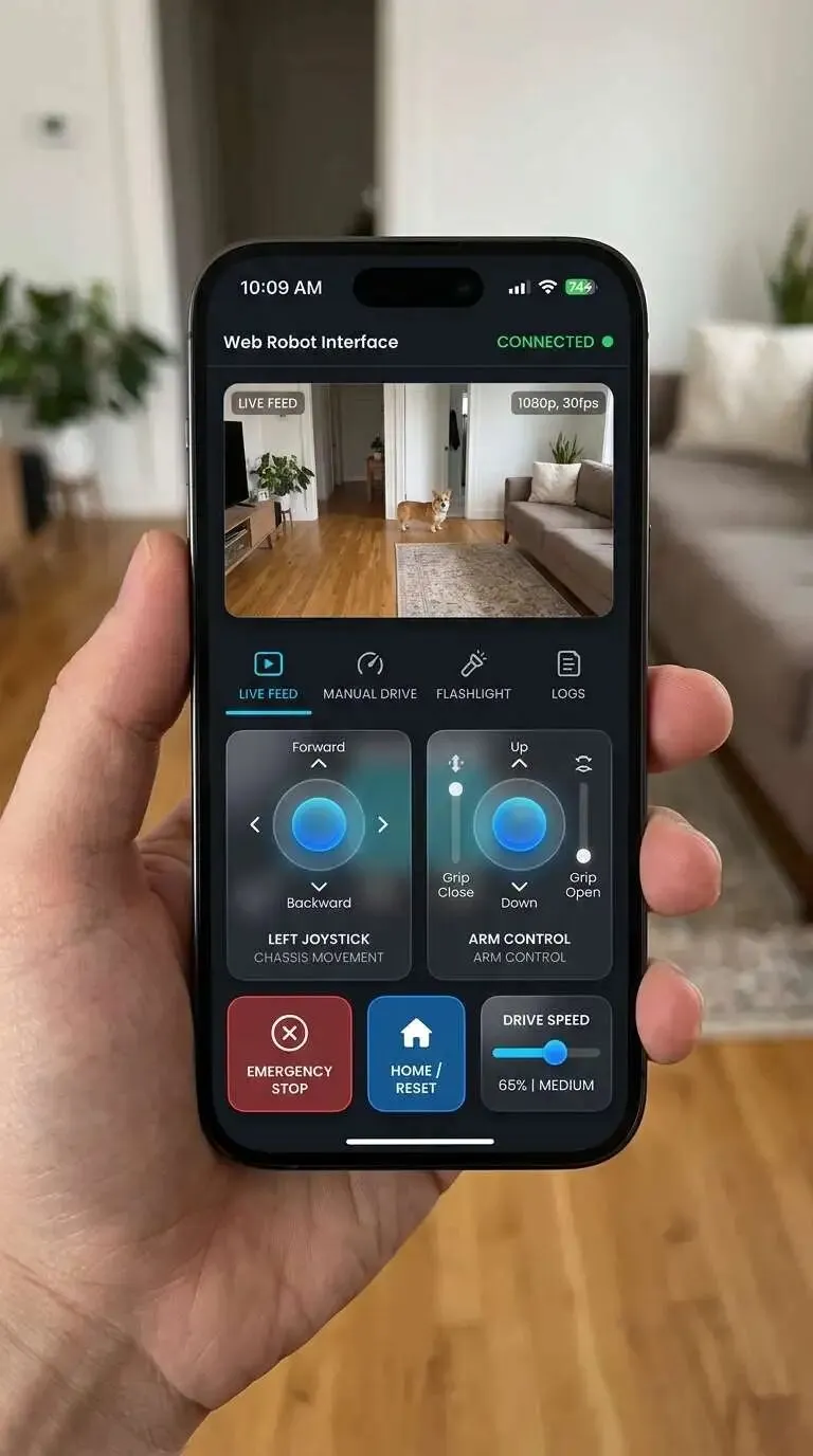 双虚拟摇杆(底盘控制 + 预留机械臂) 实时视频流 紧急停止 + 归位按钮