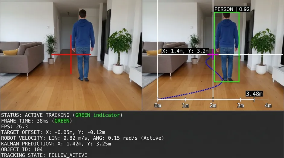 Python# 核心逻辑:视觉伺服def compute_speed(target_x, target_width):# 水平控制:目标在左则左转,在右则右转if abs(target_x - frame_center) > dead_zone:angular = kp_angular * (target_x - frame_center)# 距离控制:目标太小则前进,太大则后退error = target_width - current_widthlinear = kp_linear * errorreturn linear, angular |
