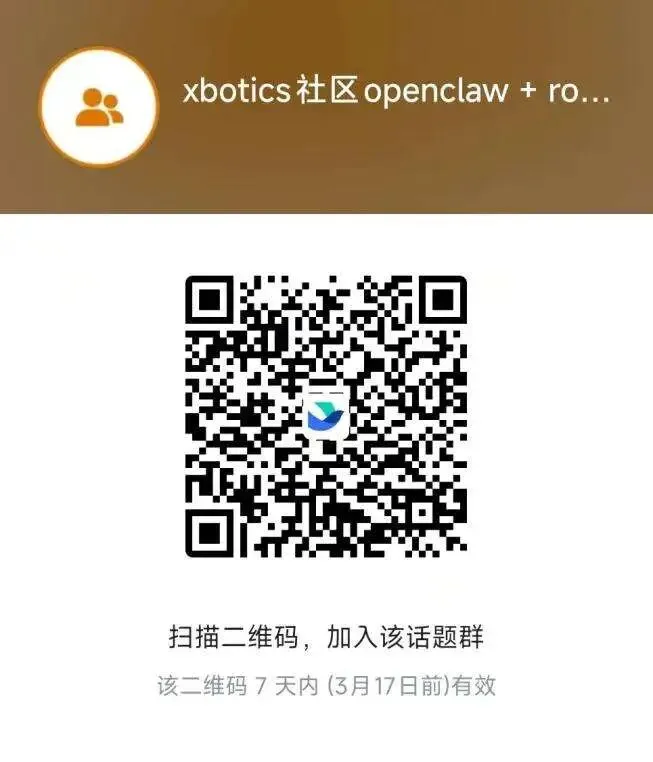 欢迎加入Xbotics社区的「OpenClaw + Robot」飞书群——这里是「OpenClaw + Robot」的第一社区。