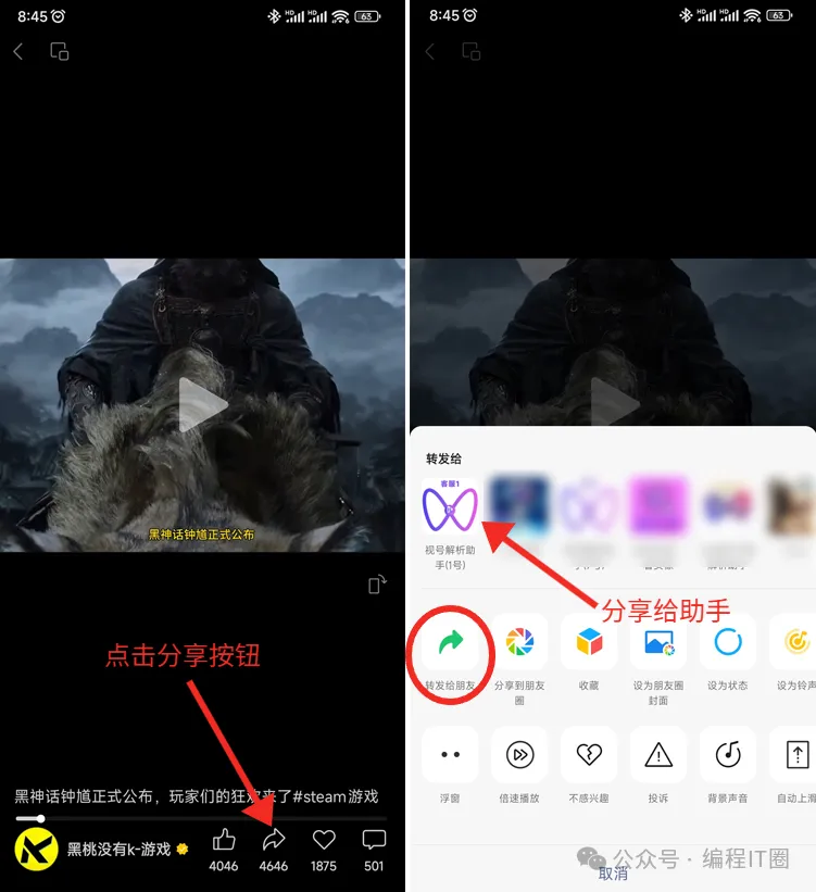 第一步:打开视频号的视频,点击下面的分享按钮,选择视频号助手,然后分享给它;第二步:这时视频号助手会返回一个下载链接,然后点击链接,看到保存按钮就可以直接把视频下载啦。好啦,整个下载就这么简单,已经完成。只需要2个步骤。如果后续你还需要使用,就更简单了,看到视频,直接转发给助手。经完成视频的下载了,完全没有任何平台的水印。就在近期官方正式公布了黑神话钟馗,这个IP选的非常好,期待啊!————差点忘记分享工具啦!!在最下面,大家添加视频号助手就可以啦!添加下方的机器人助手