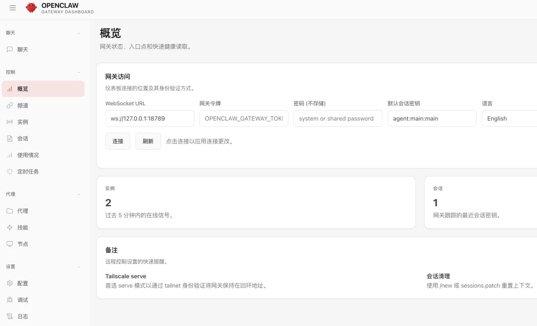 openclaw start浏览器打开 http://127.0.0.1:18789/,进入本地控制台