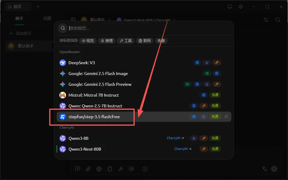 这里将这个免费模型名称粘贴进去:stepfun/step-3.5-flash:free