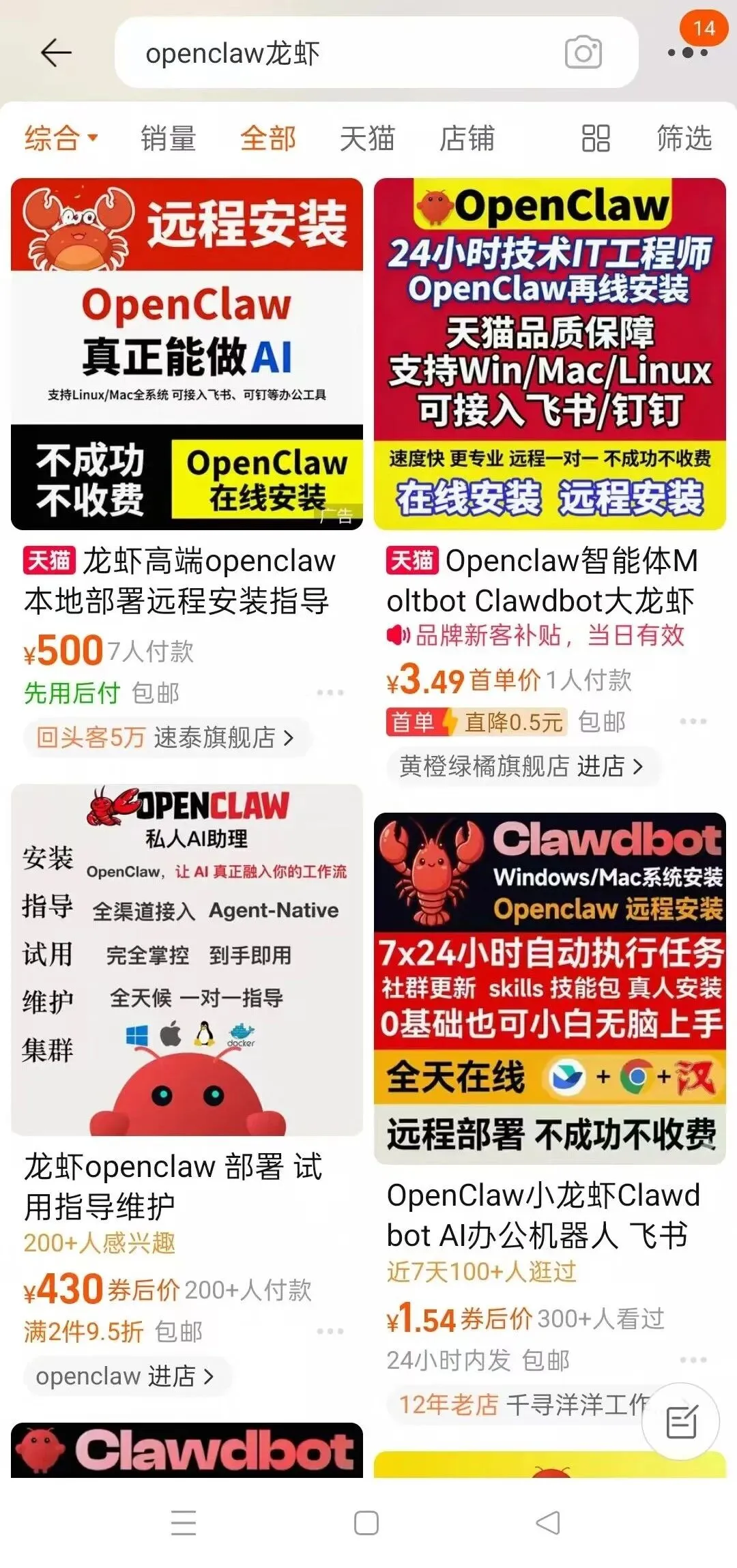 电商平台上,以 “OpenClaw” 为关键词检索,可见众多提供远程部署服务的店铺,售价从数十元到上千元不等,部分链接销量已破百。