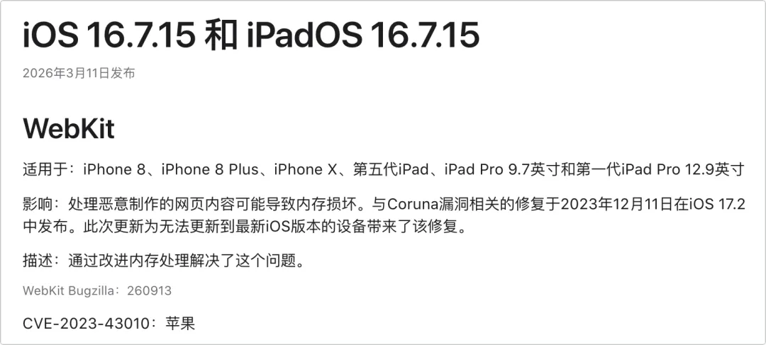 苹果更新页面中没有写明更新内容,查阅安全更新日志发现,iOS 16.7.15 修复了一个 WebKit 的安全漏洞