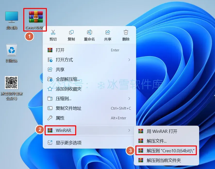 1.解压安装包:①鼠标右击【Creo10.0(64bit)】压缩包②选择电脑上的解压软件(如:WinRAR压缩)③点击【解压到 Creo10.0(64bit)】。