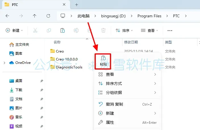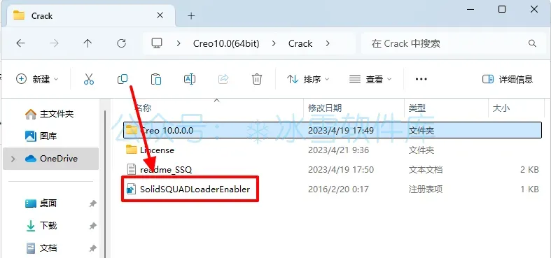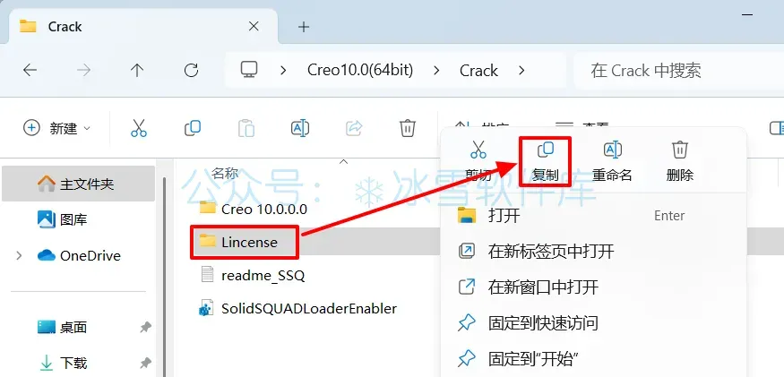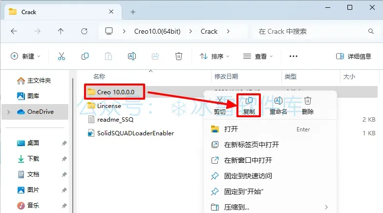 22.回到安装包解压后的【Crack】文件夹,鼠标右击【Creo10.0.0.0】选择【复制】。