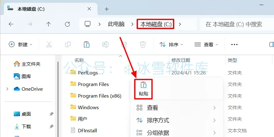 5.打开电脑C盘,鼠标右击空白处选择【粘贴】。