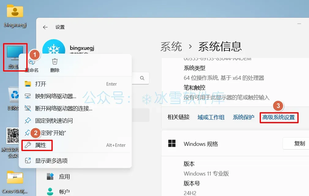 10.①鼠标右击桌面【此电脑】②选择【属性】③点击【高级系统设置】。