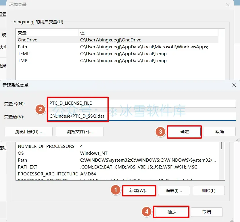 12.①在系统变量下方点击【新建】②输入变量名【PTC_D_LICENSE_FILE】和变量值【C:\Lincese\PTC_D_SSQ.dat】③点击【确定】④点击【确定】。
