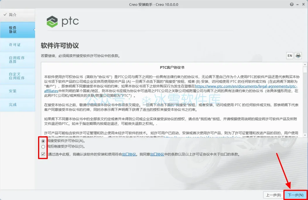 16.先选择【我接受软件许可协议】后勾选【通过选中……】,点击【下一步】。