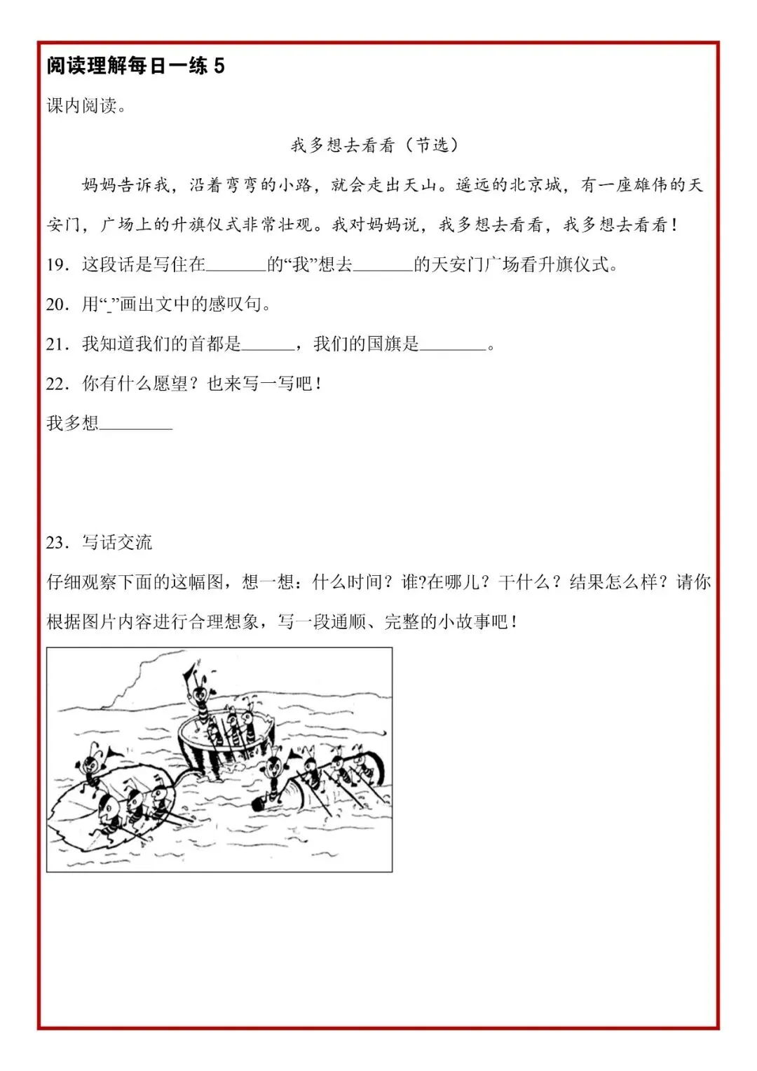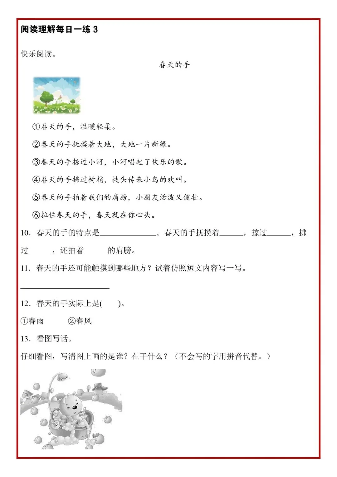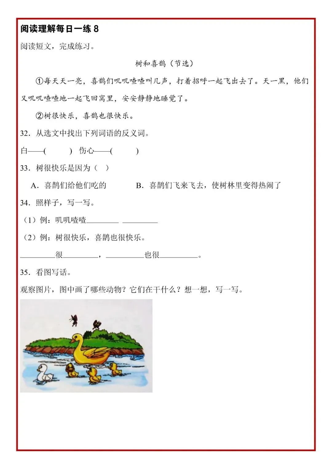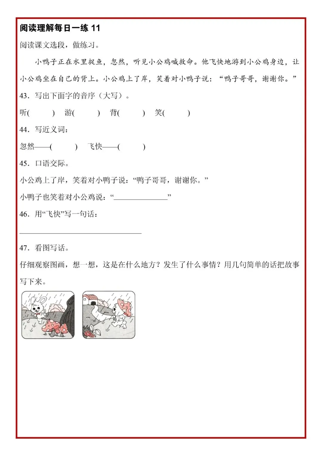 一年级语文下册《阅读理解每日一练》,可下载打印文末有高清电子版领取方式由于篇幅有限,高清完整版请下载电子版哦领取完整电子版方式:①:发财的小手点一点右下角“👍”和“❤️”②:关注公众号后,在对话框中回复:016(点击名片可直接关注)↑↑↑