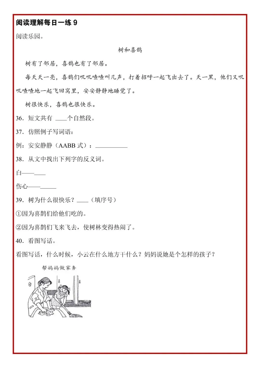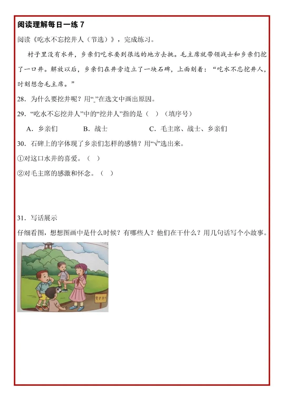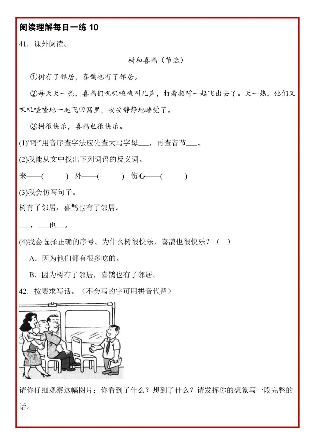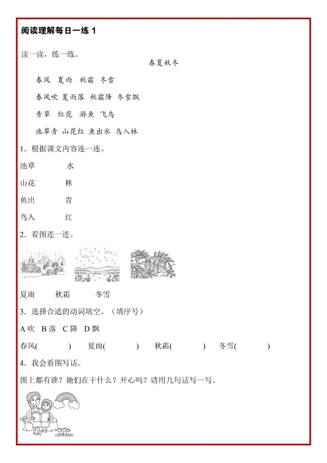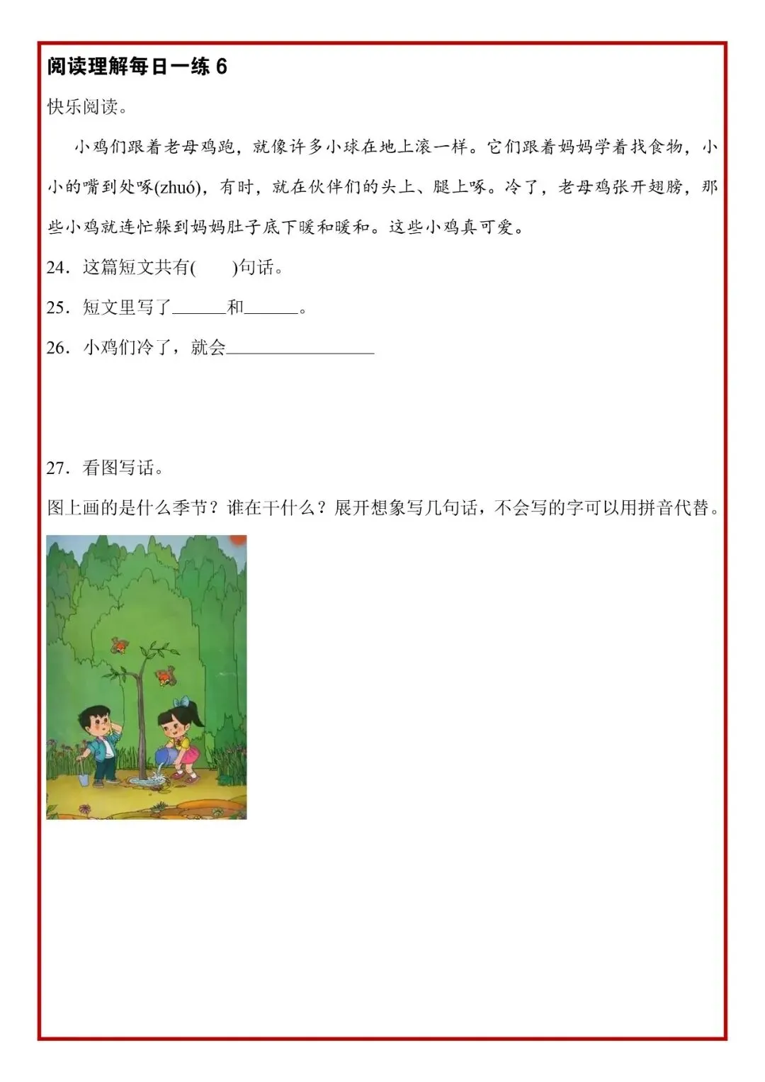 一年级语文下册《阅读理解每日一练》,可下载打印文末有高清电子版领取方式由于篇幅有限,高清完整版请下载电子版哦领取完整电子版方式:①:发财的小手点一点右下角“👍”和“❤️”②:关注公众号后,在对话框中回复:016(点击名片可直接关注)↑↑↑