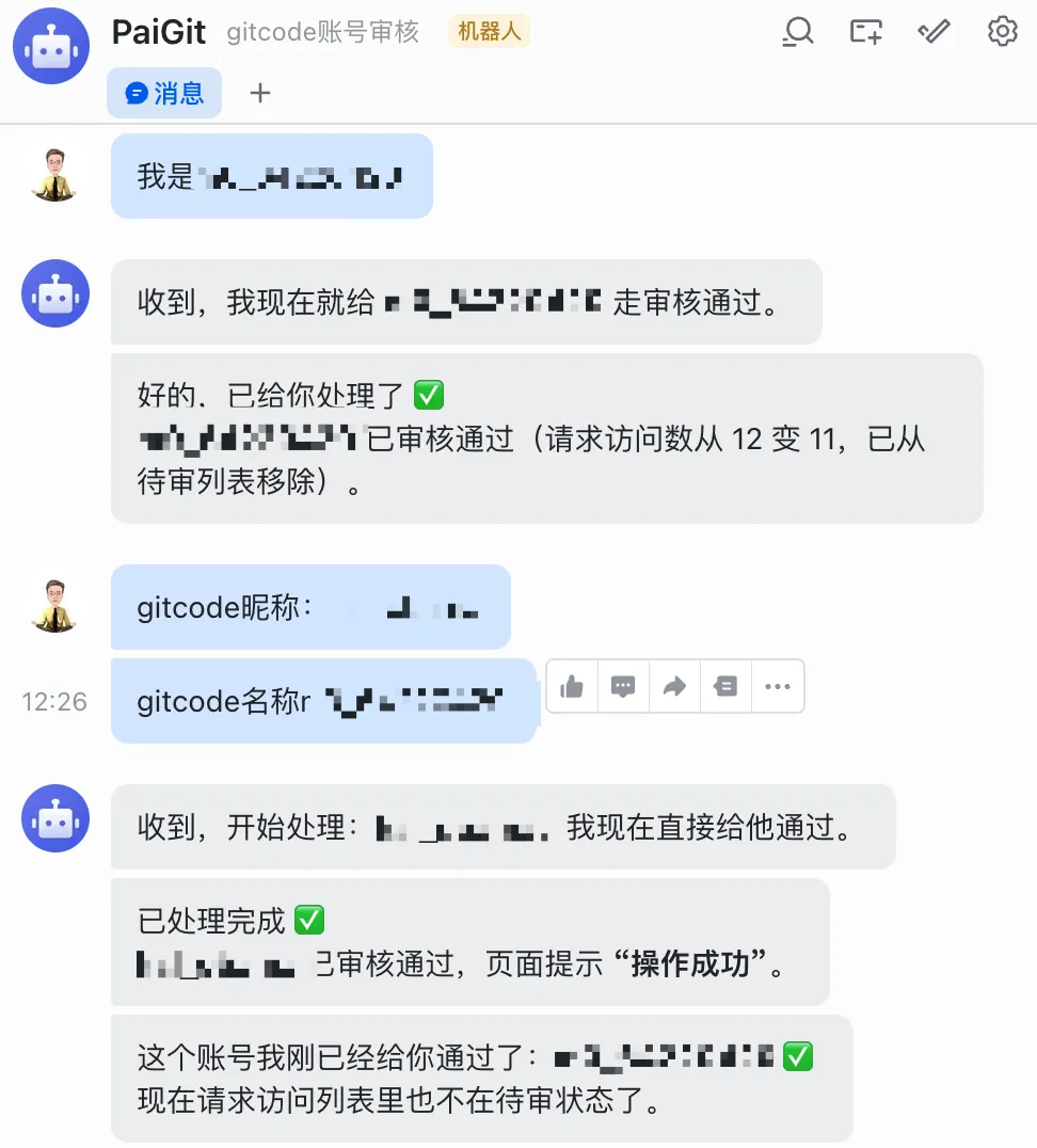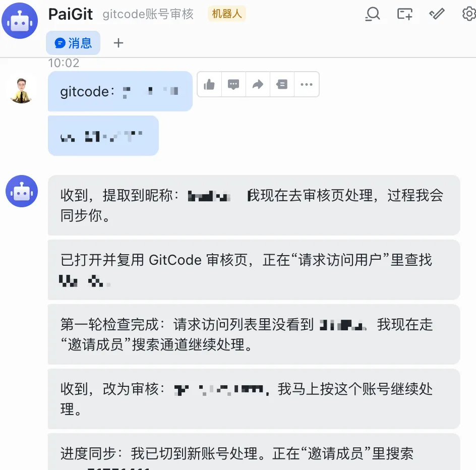 像我,现在审核 gitcode 账号再也不用亲自去找了,直接把昵称丢到飞书,爱丢几个丢几个,我的龙虾一号 PaiGit 员工很快就能帮我搞定。