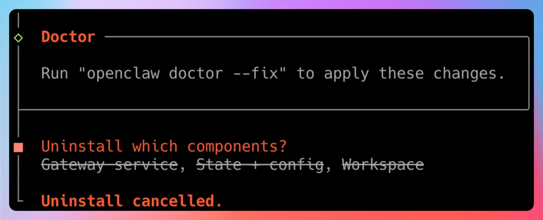 openclaw uninstall这个命令会弹出一个交互界面,让你选择要删除哪些内容。用空格键全选,然后回车确认。它会帮你: