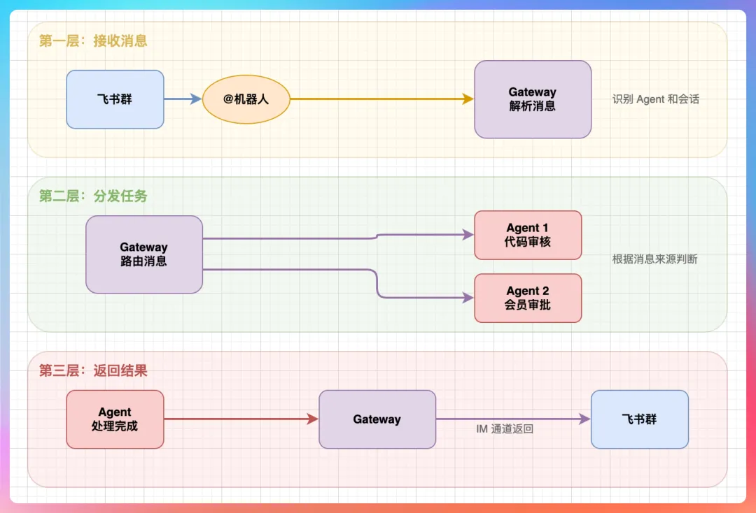 你在飞书群里@机器人,飞书会把消息推送到 Gateway。Gateway 收到后,解析消息内容,识别是哪个 Agent、哪个会话。