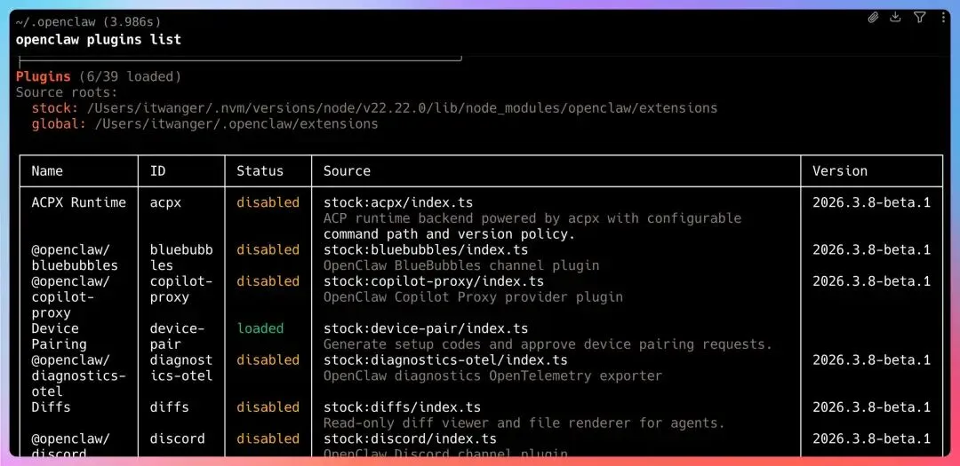 插件安装在 ~/.openclaw/plugins/ 目录下,每个插件是一个独立的 npm 包。