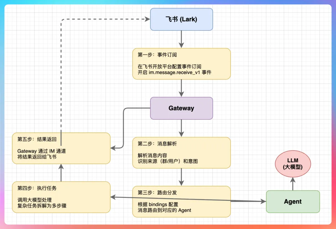 飞书把消息推给 Gateway。这需要在飞书开放平台配置事件订阅,开启 im.message.receive_v1 事件。