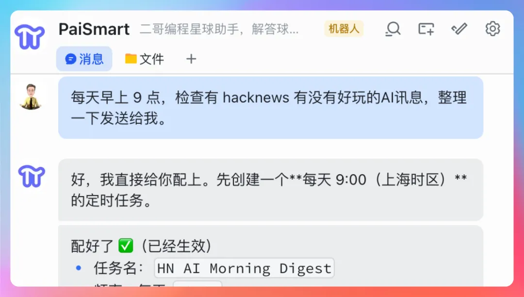 “定时任务呢?你刚才说的每天早上 9 点给你推送最新的 hacknews 消息,是怎么实现的?”