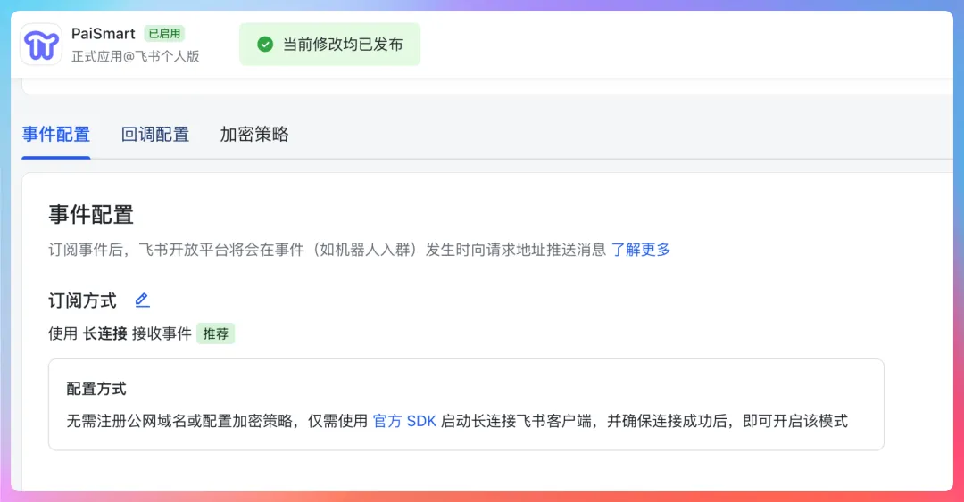 事件订阅已开启 im.message.receive_v1事件已添加长链接模式已启用