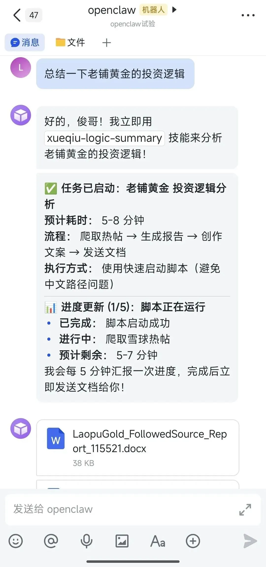真的,openclaw值得折腾但是呢,好像各个文章,各个视频又没有说出openclaw到底能干啥。所以一开始,我就没打算去尝试,当我被漫天消息轰炸的忍无可忍的时候,我终于决定去尝试一下,看看这openclaw到底是个什么鬼东西。是的,我也被openclaw迷住了,至少我觉得它真的值得大家去折腾折腾,试一试。可以说,现在几乎不可能存在一个能满足大家共同需求的大商机。所以啊,不要指望openclaw能满足一个我们的共同需求,这也是我们刷各种关于openclaw的视频,都看不明白它到底能干啥。因为openclaw能解决的问题,能满足的需求,是因人而异的,都是一些非常小众的需求。但是呢,它又非常强大,它能结合你的需求高度定制各种功能。对!这就是openclaw最厉害、最强大的地方,它不像其他的软件或APP,各种功能都已经开发好了,并且不能更改,有什么功能,你就得用什么功能。openclaw像一个毛坯软件,同时它支持私人定制,到底要实现什么功能,解决什么问题,需要你自己去提要求,并且需要你教它,一步步的指导它学会你想让它学会的技能。这也是为什么大家都在说养龙虾,真的要养,真的很形象。具体到我,openclaw有什么用?它能帮我做什么呢?我这两天开发了一个小功能,就是爬取雪球某股票页面下前100个热帖,然后用AI大模型分析这些热帖内容,总结一份该股票的投资逻辑文章,以便我能快速了解一只股票。现在,我在刷雪球时看到大家聊到某股票,如果我有点感兴趣,我就在手机端聊天框里对openclaw说“总结一下xx股票投资逻辑”,它就会去运行分析脚本并把结果发我,像下面这样:这是很小很小的一个需求,但对我来说,又是很有用的一个功能。openclaw就是能解决这些小众且个性化的需求。openclaw跟我之前用到的所有的软件完全不一样,它是全新的一种形式,甚至可能会产生一种颠覆性的结果。我觉得它有点像当年的电脑从命令行界面走向图形界面,以后的电脑可能会走向一个新的形式?至少,我现在是给openclaw配了一台单独的Macmini,这台Macmini完全属于它,某种意义上说,此时我用电脑的方式已经发生了一些改变。最近小米也在手机端测试miclaw,我看了一些博主发的测试视频,也挺让人惊艳的,一些我们多年前觉得带有未来科幻感的东西,正在走进现实。对于openclaw,网上有很多评论聊赚钱的问题。怎么可能存在一个明显可以用openclaw赚钱,且大家都可以做的商机呢?我不是开发了前面那个小功能吗?就是让openclaw爬取雪球股票热帖给我快速生成xx股票投资逻辑。我是不是可以把这个功能卖给需要这个功能但没有开发能力,或者不想折腾的投资者。比如我跟你们说,5元钱,我就可以把这个功能开放给你使用,方法也很简单,我直接把你拉到飞书群里去,你要用就@openclaw机器人调用就行了。先不管能赚多少钱,但至少,openclaw是不是已经开始帮我赚钱了?所以啊,能不能赚钱,商机都是要自己找的,不可能存在大家都能做且可以用openclaw赚钱的机会。当然,我这只是一个举例,我并不打算真这样做,大家不要找我拉你入群。但是,也必须要说,现阶段的openclaw使用门槛还挺高。首先安装倒不太难,可能与我用的是Macmini有关,反正现在有各种AI大模型,遇到任何问题都可以去问大模型该如何解决。甚至我用的谷歌antigravity编程软件,遇到问题它都能自动帮我解决掉。你会感到震惊,就这?这么个狗屁玩意被吹的神乎其神的?很正常,因为你还没入门,我也说了,openclaw像毛坯房,你还没给它装修,所以一开始会显得很傻很傻。你要给它安装技能,你要教它帮你做各种事情,它会越用越聪明。其实我才探索了openclaw两三天,我自己还云里雾里的,但感觉我的openclaw已经开始有点作用了,并让我感到惊艳。之前我一直很不明白,老年人学用智能手机怎么就那么难,都是一些很基础的操作啊,三岁小孩都能学会。像我这年龄,如果完全不去摸索AI的使用方式,再经过几年迭代,可能我真的就搞不懂了,这skill那技能的,还什么agent、memory,各种名词,给人搞得云里雾里的。更关键是,它是全新的使用方式,全新的逻辑,跟原有的软件使用方式完全不一样。反正,我尝试openclaw后,觉得它真的完全是另一种方式,另一种思维。如果我一直不接触,不实际上手摸索它,我觉得我真的会掉队的,就像老年人学不会智能手机那样。比如,后面可能又来了一个新的东西,但它是在openclaw的基础上改造升级的,如果有openclaw的基础,去理解这个新东西可能就比较简单,而没有openclaw的基础,理解这个新东西就更难了,门槛更高了。老年人不就是这样慢慢落后于时代的吗?因为他们没有慢慢接触并使用科技方面新东西的基础,让他们一下子去用智能机,就觉得无比困难。所以啊,面对日新月异的AI时代,还是得有点折腾精神,像这些热门产品还是得摸索一番,努力让自己跟上时代脚步。