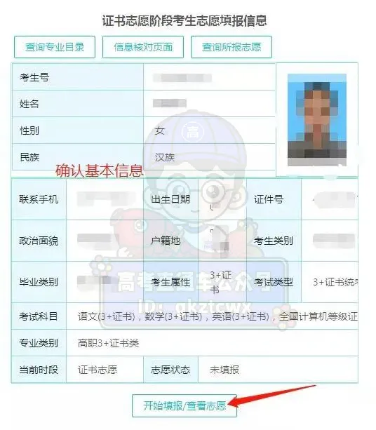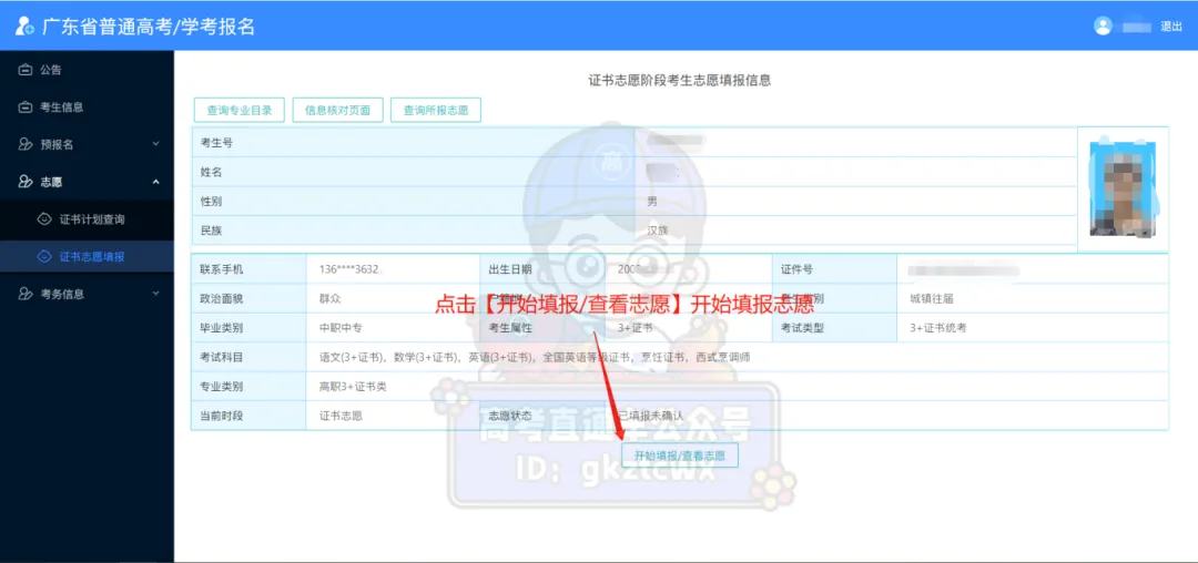 选择【证书志愿填报】,进入【考生志愿填报】页面核实个人信息,并进入对应批次填报。