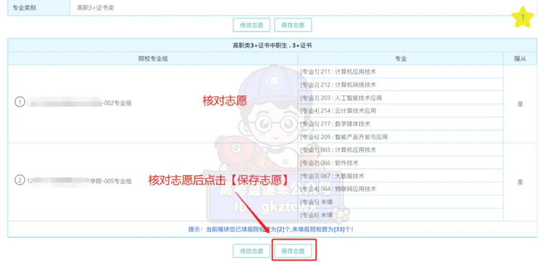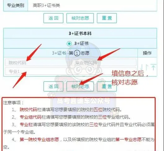 填完院校和专业代码后,点击“核对志愿”按钮,认真核对自己选的院校和专业是否正确,如有错误,可点击“修改志愿”按钮进行修改。