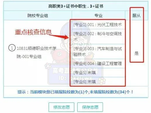需要注意的是,现在志愿是默认服从的,表的右边可以调整志愿之间的位置。