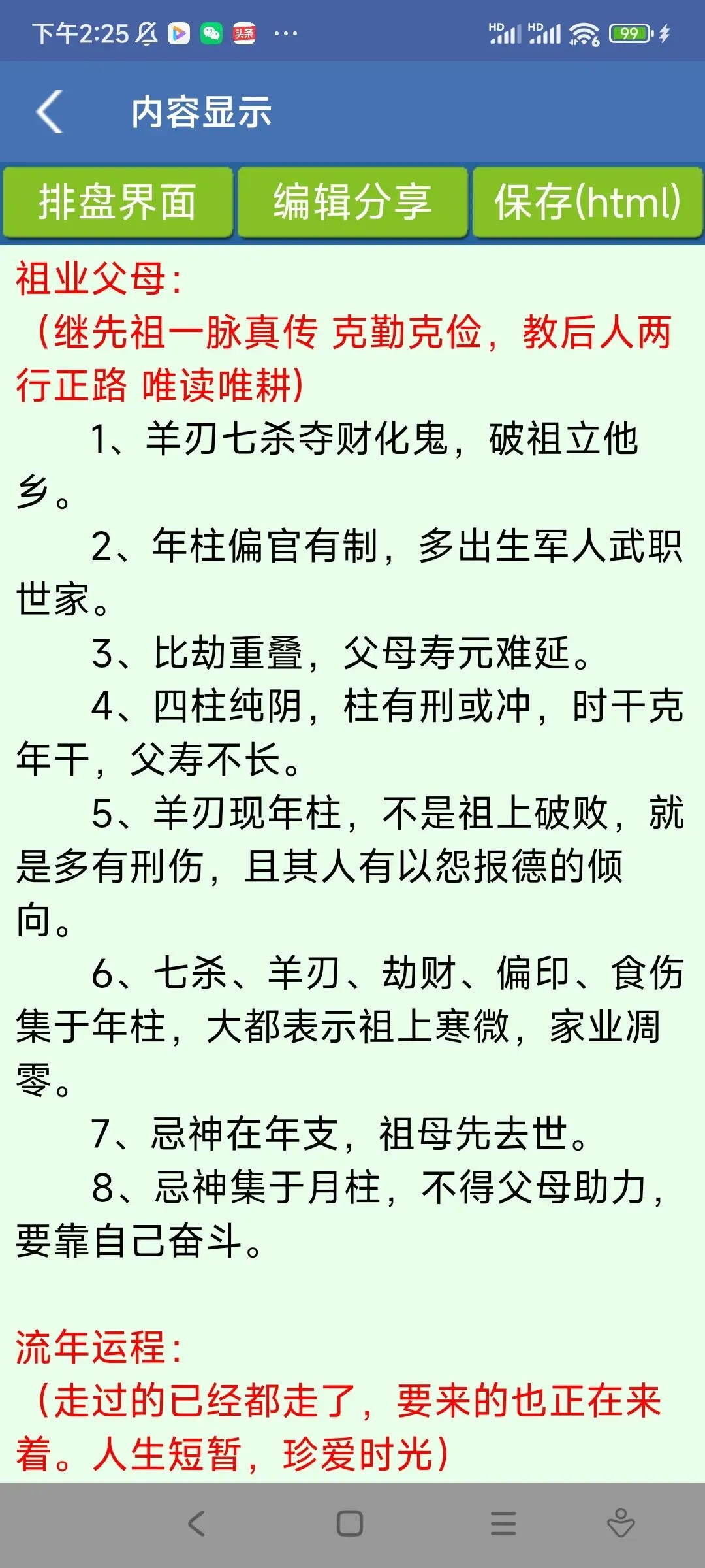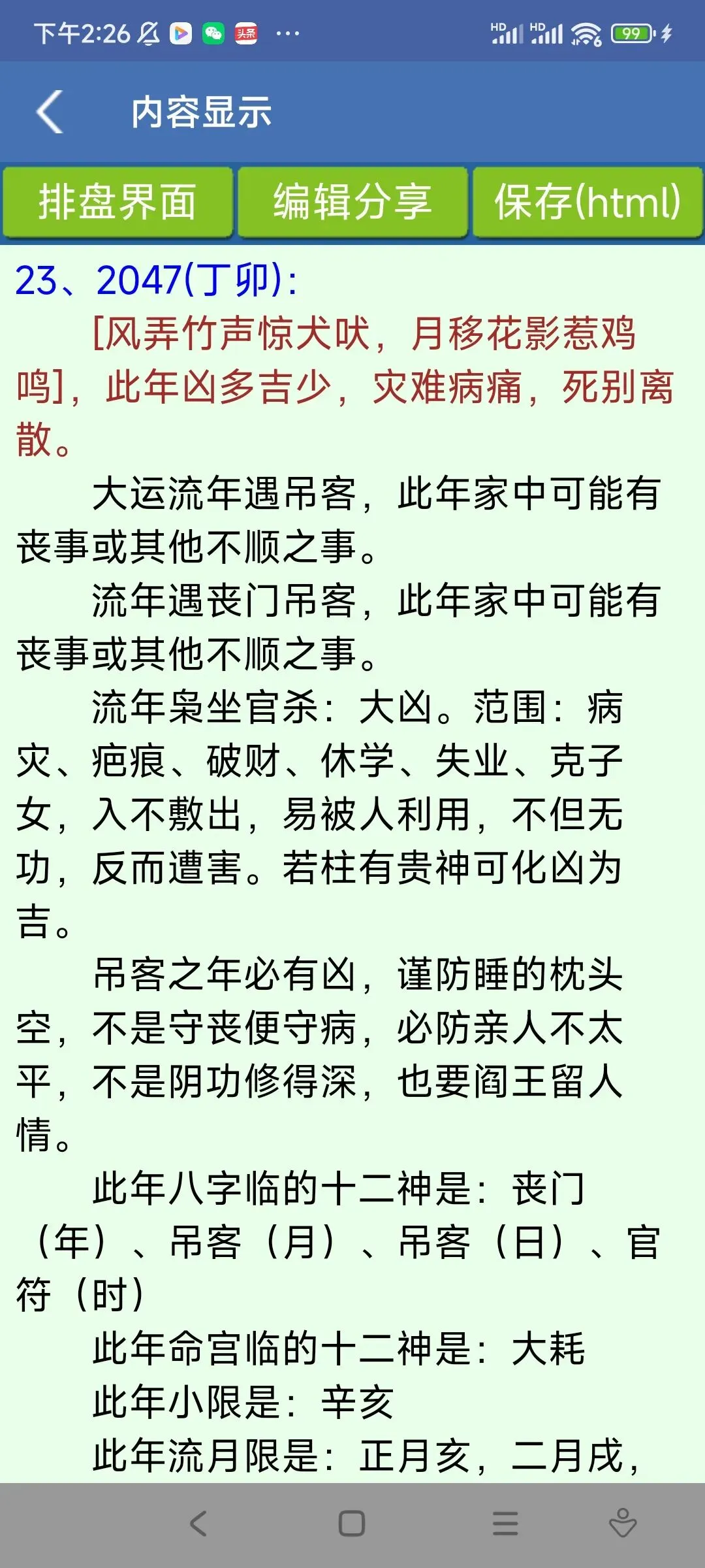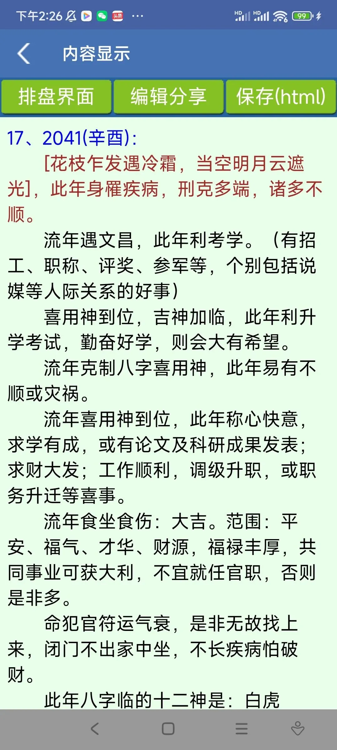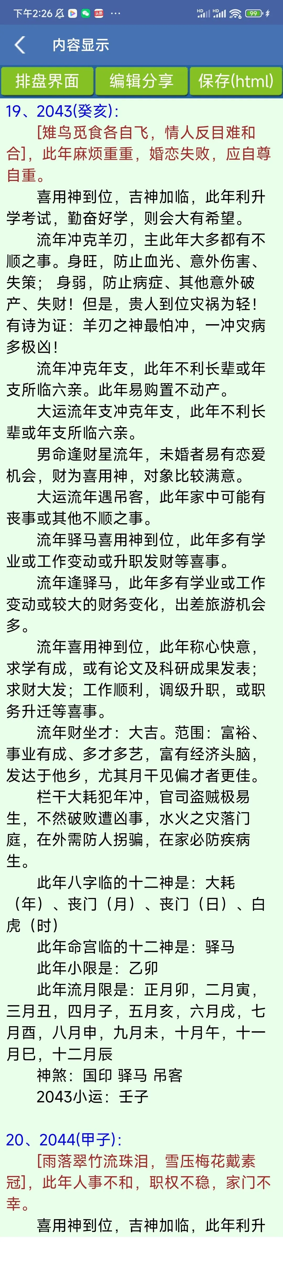 ③.还有:小运、终身卦、后天补救、穷通宝鉴、流年变化、称骨论命、流年神煞、重大关口、大运流年干支、串宫压运、性格、婚姻、兄弟姐妹、子女、财运、功名事业、健康状况、祖业父母。
