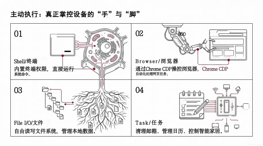 报告覆盖技术原理、生态格局、安全风险、商业变现、未来趋势五大核心模块,既详解 OpenClaw的持久化记忆、自我进化、主动执行等技术特性,也聚焦国内生态适配(如国产模型集成、飞书 / 钉钉等平台接入)、企业级应用改造(如权限管控、SOP标准化),还预判了硅基经济体的演进路径与潜在风险,同时提供了从个人“养虾”到一人公司、中小企业的全场景变现方案,为政府监管部门、企业决策者、开发者、研究者提供了兼具学术深度与实操价值的全景参考。