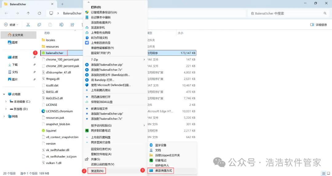 3、找到【balenaEtcher】程序,右键依次点击【显示更多选项】、【发送到】、【桌面快捷方式】,完成软件桌面快捷方式的创建