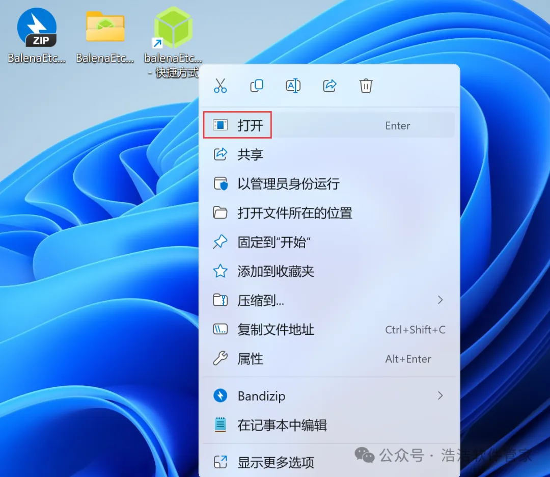 4、回到桌面,右键桌面上的【balenaEtcher软件图标】,点击【打开】