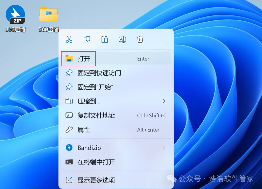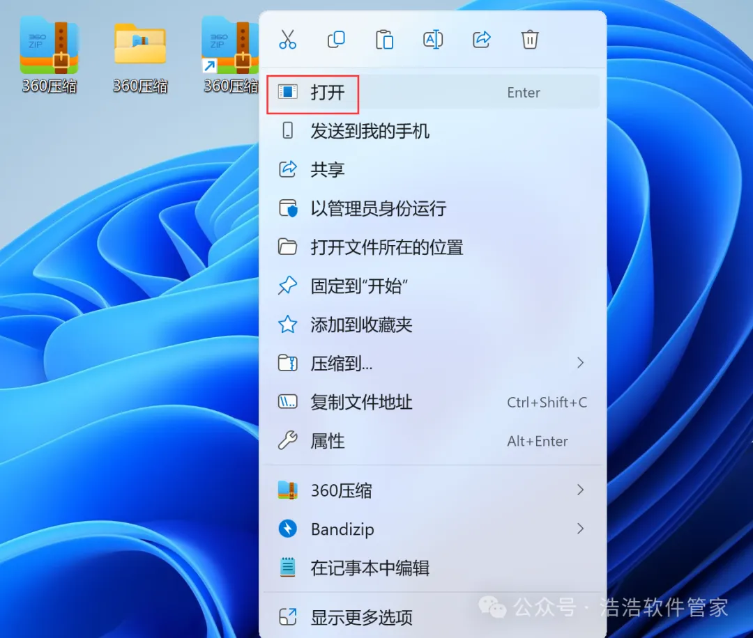8、回到桌面,右键桌面上的【360压缩软件图标】,点击【打开】