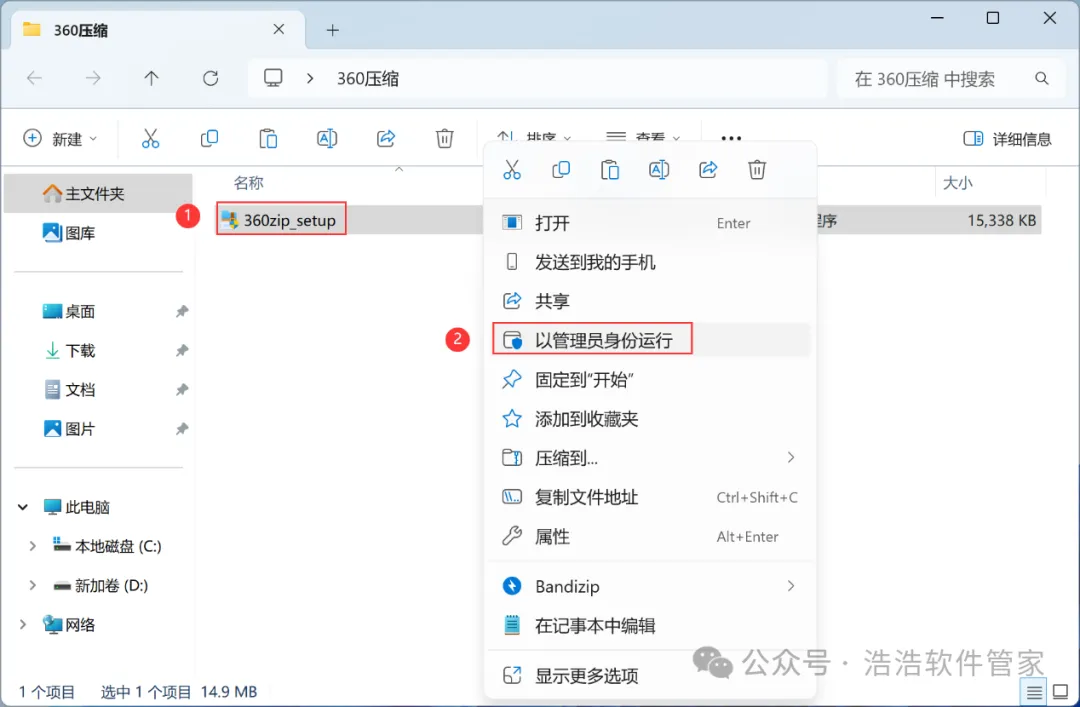 3、找到【360压缩】应用程序,右键选择【以管理员身份运行】它