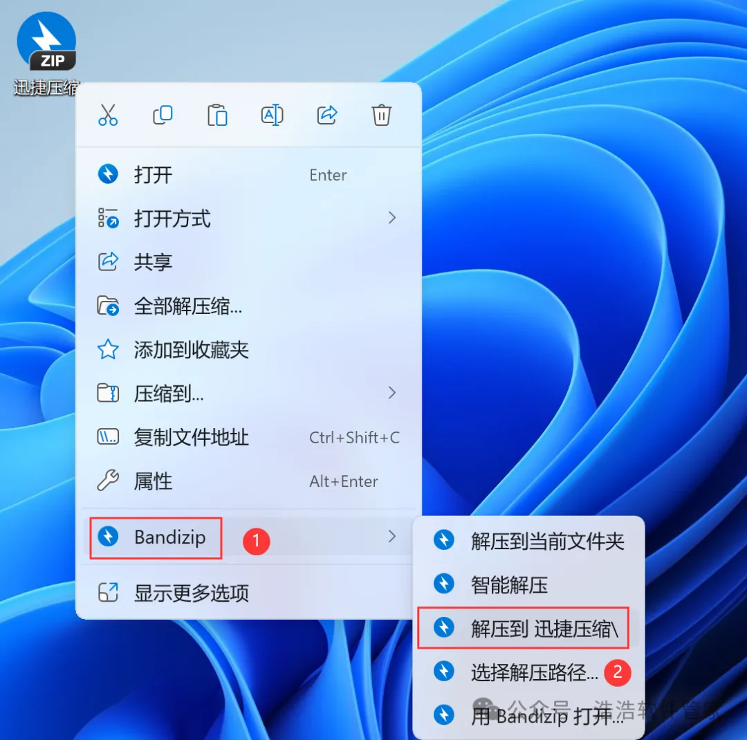 1、下载迅捷压缩软件安装包到电脑上,右键选择【解压到迅捷压缩\】
