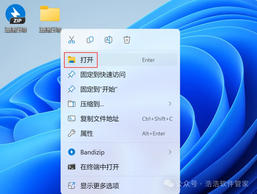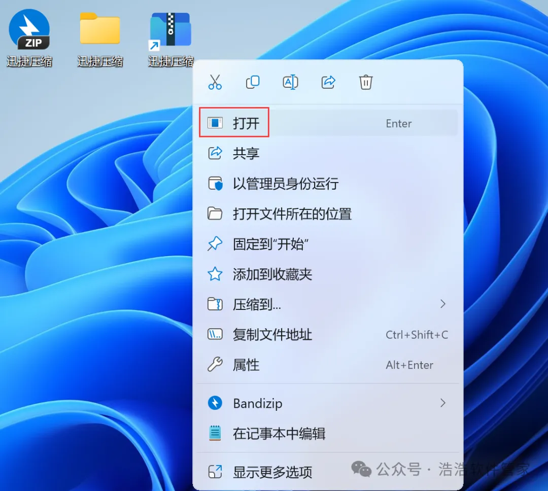 8、回到桌面,右键桌面上的【迅捷压缩软件图标】,点击【打开】