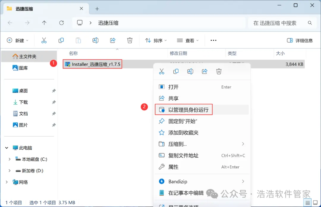 3、找到【迅捷压缩】应用程序,右键选择【以管理员身份运行】它
