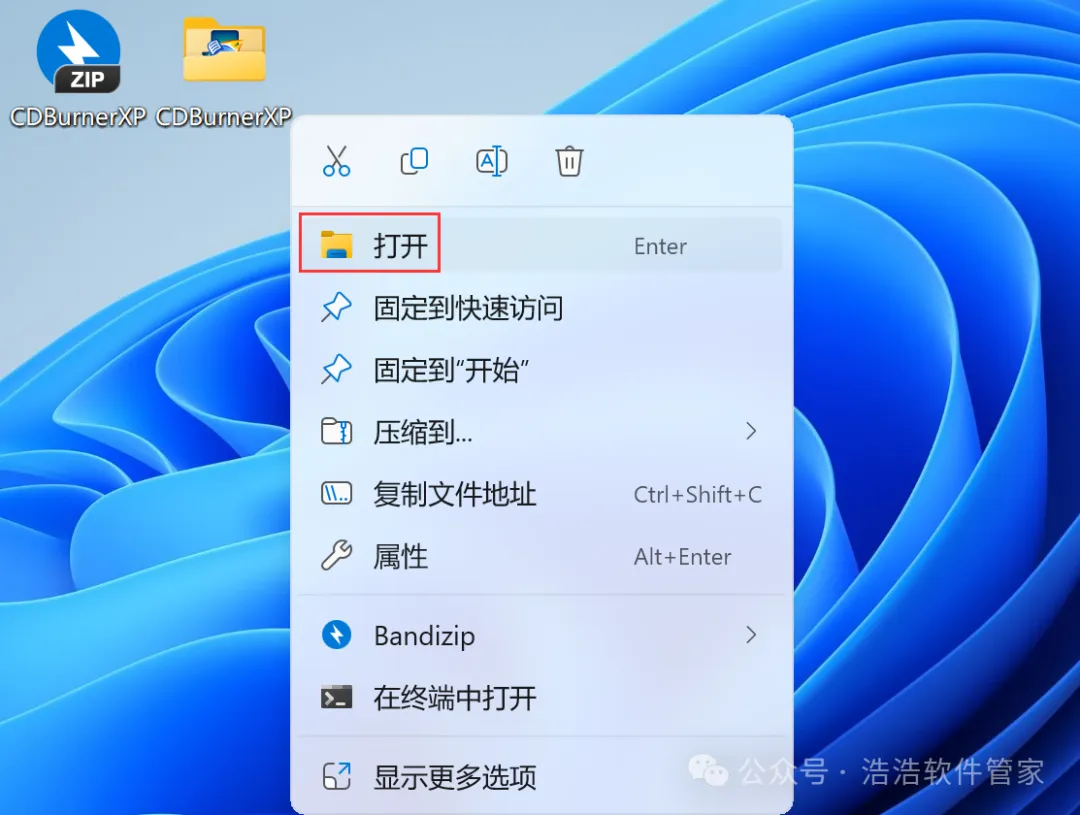 11、回到桌面,右键桌面上的【CDBurnerXP软件图标】,点击【打开】