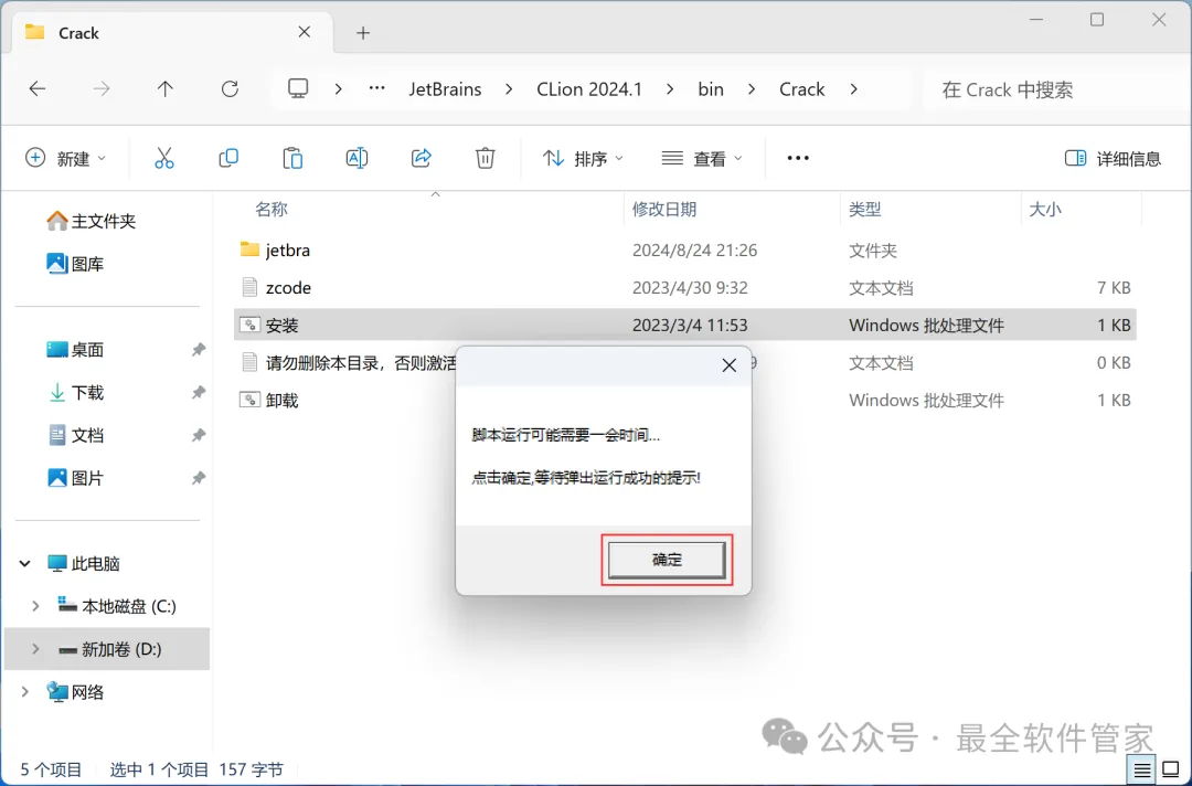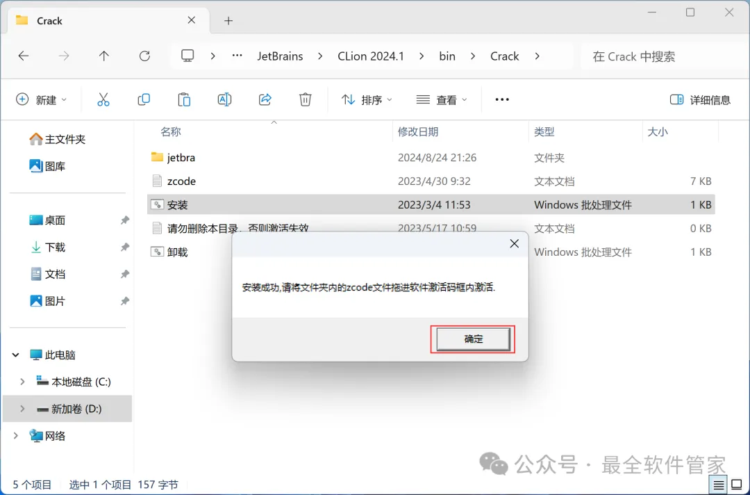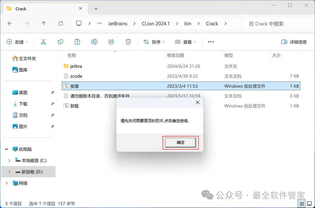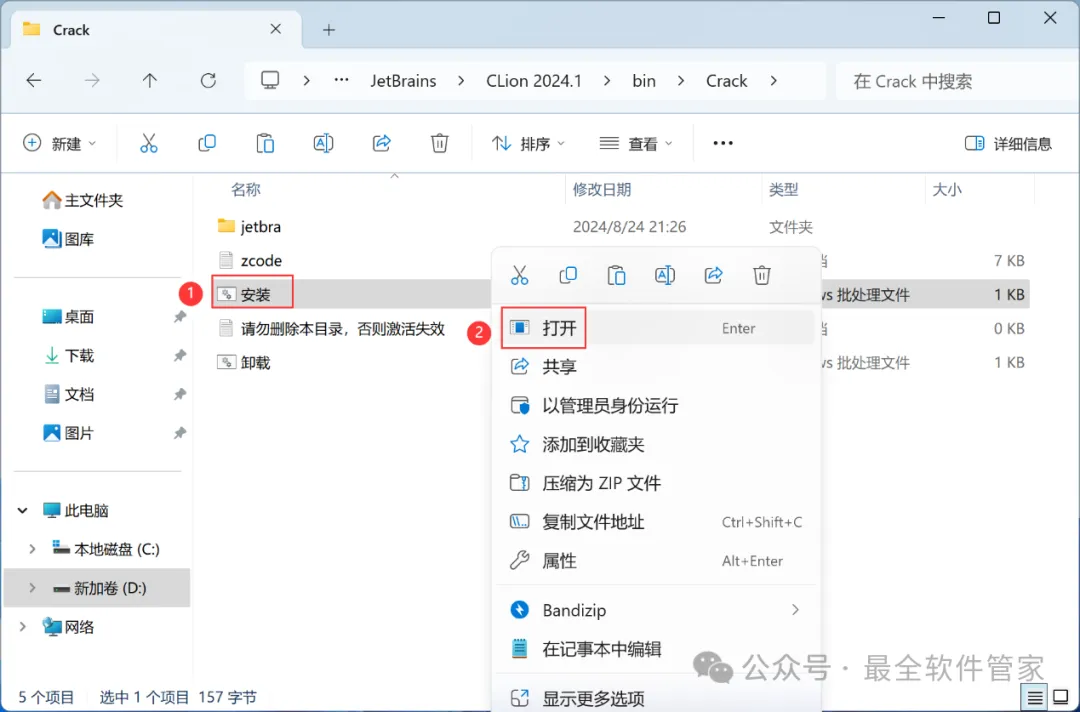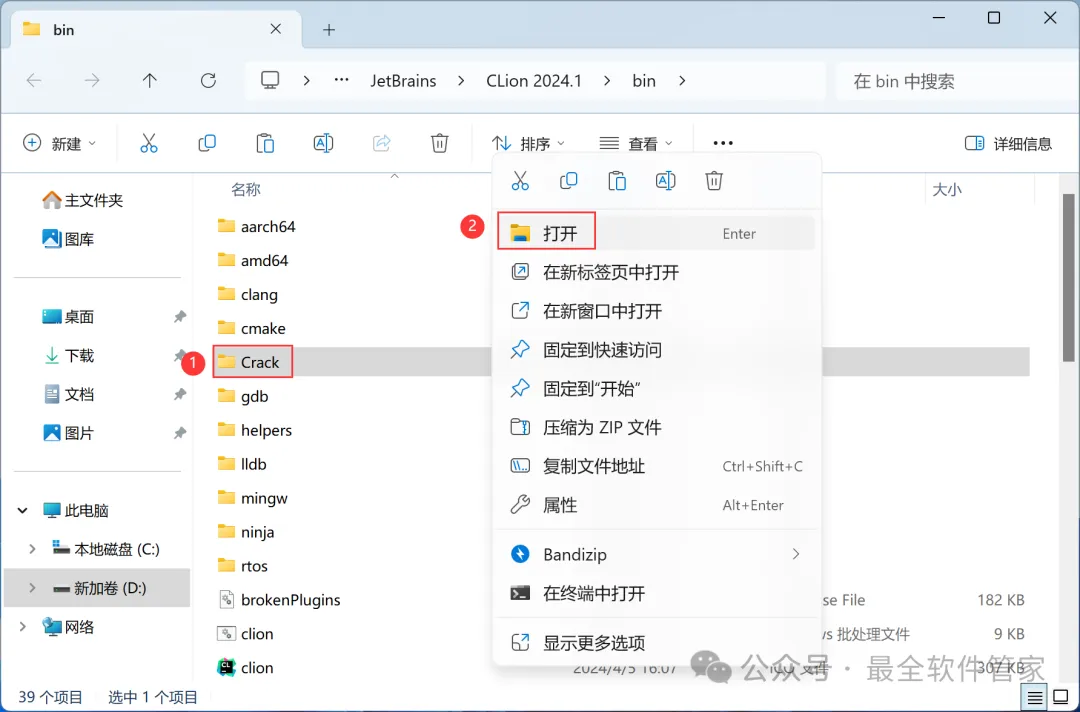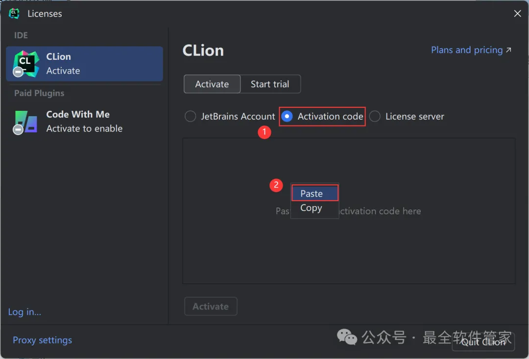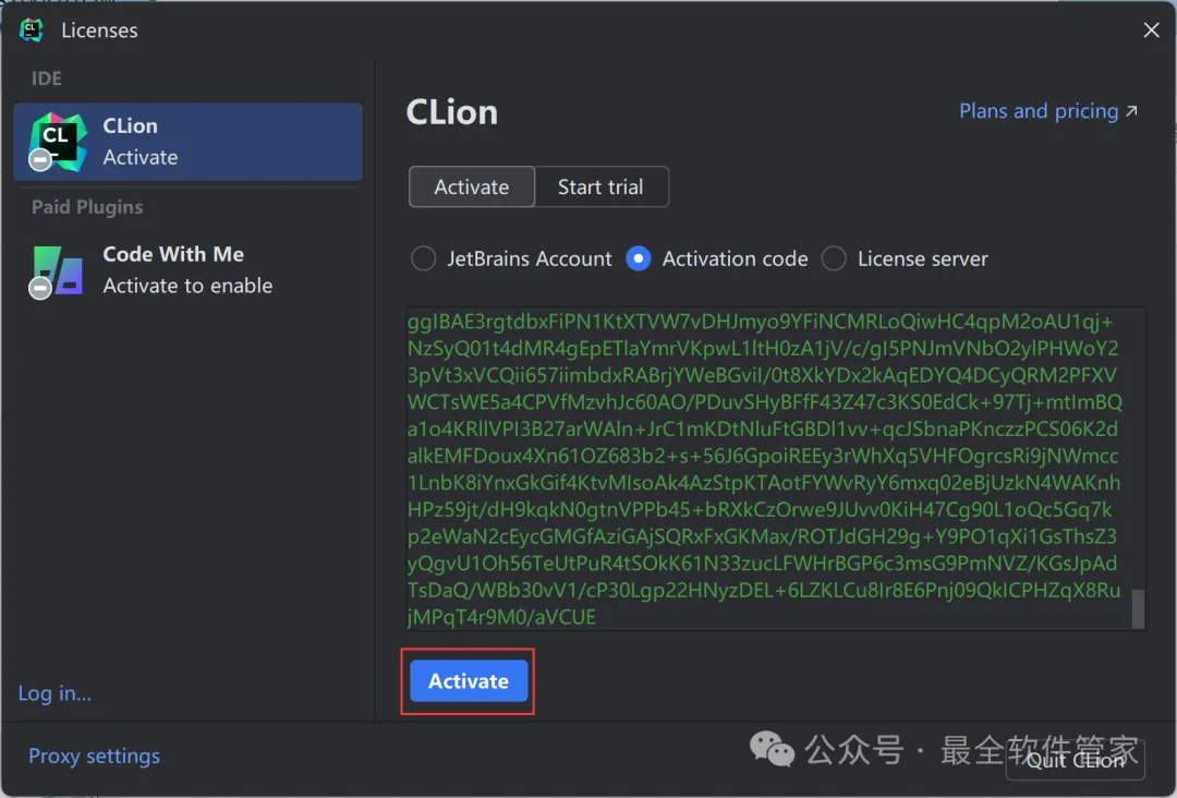 [不限速下载]:免费获取百度网盘不限速下载工具。公众号内回复:不限速[注意事项]:安装前请关闭网络、杀毒软件和防火墙,否则易安装失败。公众号内回复:1[解压软件]:小编用的解压软件是Bandizip,获取Bandizip软件安装包。公众号内回复:21、下载CLion 2024软件安装包到电脑上,右键选择【解压到CLion 2024\】3、找到【CLion-2024.1】应用程序,右键选择【以管理员身份运行】它5、软件默认安装在C盘,可自定义更改软件安装位置,这里小编选择安装在D盘;点击【下一步】6、勾选【创建Clion桌面快捷方式】,再点击【下一步】10、回到CLion 2024文件夹,找到【Crack】文件夹,右键点击【复制按钮】11、回到桌面,右键桌面上的【CLion 2024.1软件图标】,点击【打开文件所在的位置】13、找到粘贴的【Crack】文件夹,右键【打开】它18、回到桌面,右键桌面上的【CLion 2024软件图标】,点击【打开】22、回到Crack文件夹,找到【zcode】文档,右键【打开】它24、回到CLion 2024软件界面,点击【Activation code】,再右键的空白处,点击【Paste】28、以上就是CLion 2024软件安装的全过程,要是对你有帮助的话,请为小编点个赞!免责声明:软件资源均来源于网络,仅供用户交流学习与研究使用,版权归属原版权方所有,版权争议与本公众号无关,用户本人下载后不能用作商业或非法用途,否则后果均由用户承担责任;如果您访问和下载此文件,表示您同意只将此软件用于参考、学习而非其他用途,否则一切后果请您自行承担,请于下载后24小时内删除,不允许用于商业用途,否则法律问题自行承担。如果您喜欢该软件,请支持正版软件,购买注册,得到更好的正版服务。