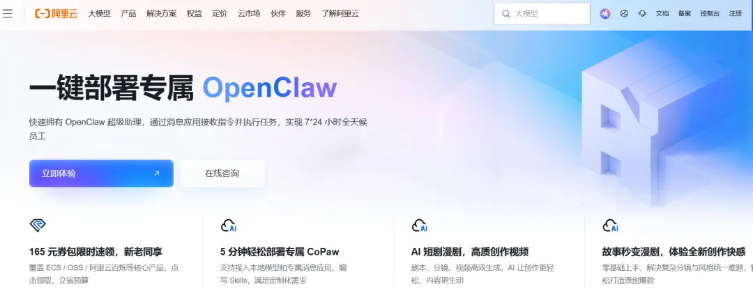 云市场提供预装 OpenClaw 的轻量应用服务器镜像https://www.aliyun.com/?spm=5176.29597918.J_4VYgf18xNlTAyFFbOuOQe.d_logo.6b69133ckmHvEm