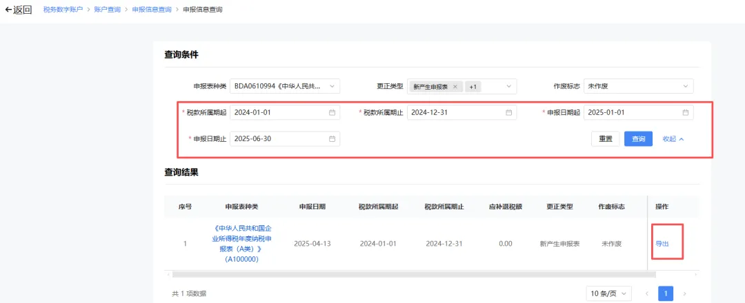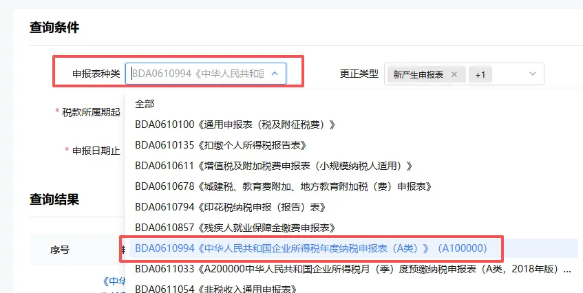 非新成立企业办理费减用的税表导出路径如下:【电子税务局】——【我要查询】——【一户式查询】——【申报信息查询】——【申报表种类】——【选择“BDA0610994《中华人民共和国企业所得税年度纳税申报表(A类)》(A100000)”】