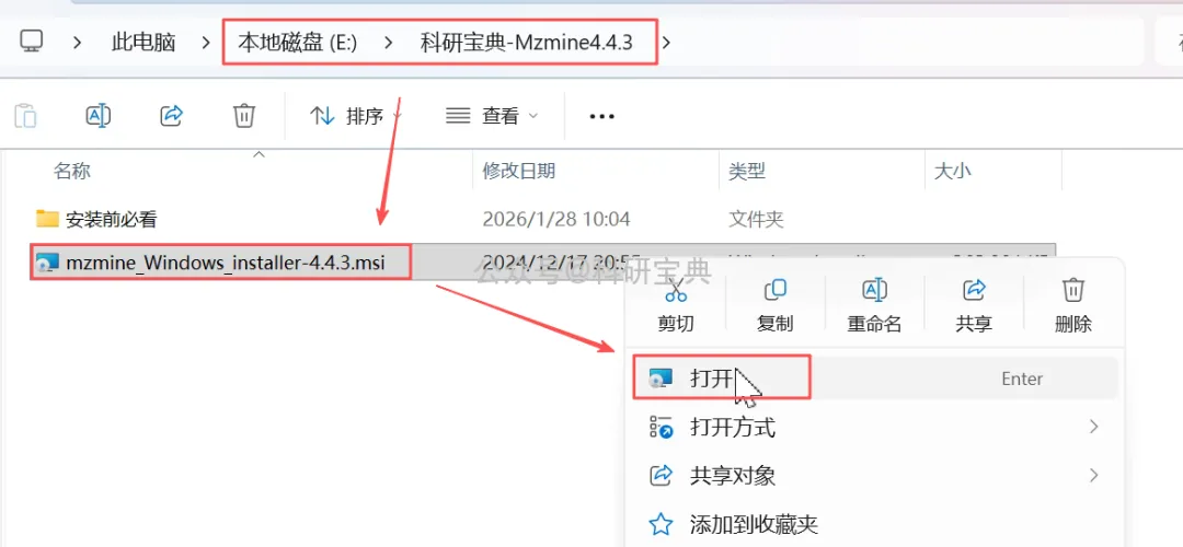 1、下载压缩包【科研宝典-Mzmine】至电脑本地,并解压(我们压缩时候没有设置密码,如果解压时候需要密码,请换一个解压软件),得到如下文件;选择【mzmine-Windows installer-4.4.3.msi】,【右键】-【打开】;